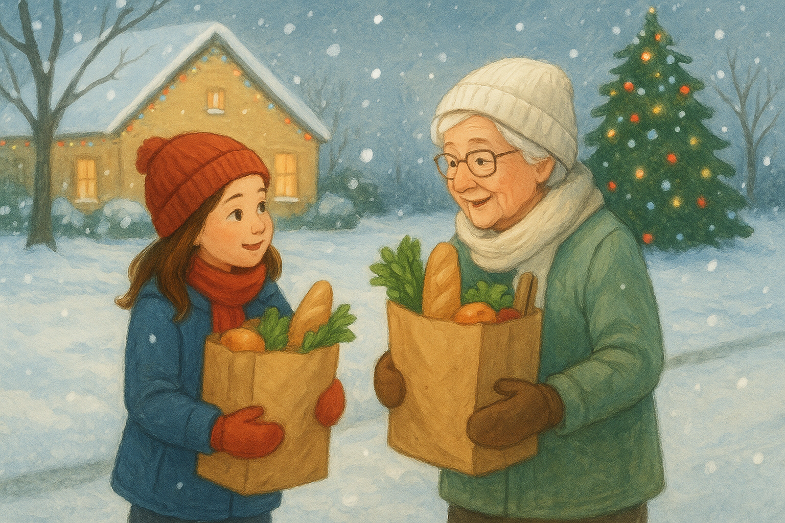 One afternoon, while walking home from school, Emma saw an elderly neighbor, Mrs. Wilson, trying to carry heavy bags of groceries through the snow. Emma ran to help her.