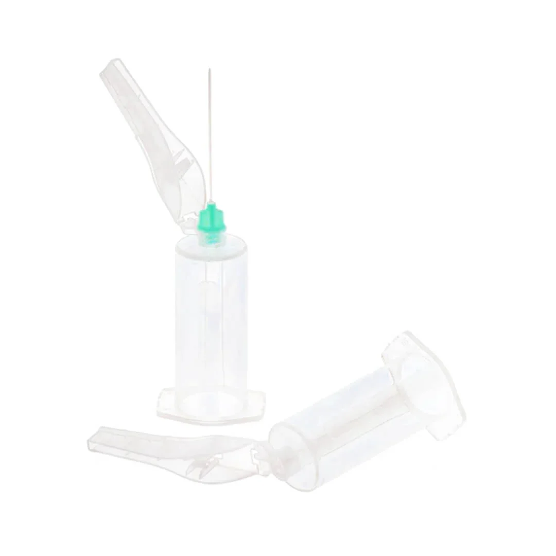 A small needle with plastic wings, used for small or difficult veins.