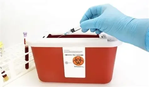 After the blood draw, the needle goes into the sharps container.