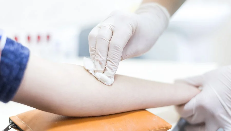 The phlebotomist cleans the skin with antiseptic.