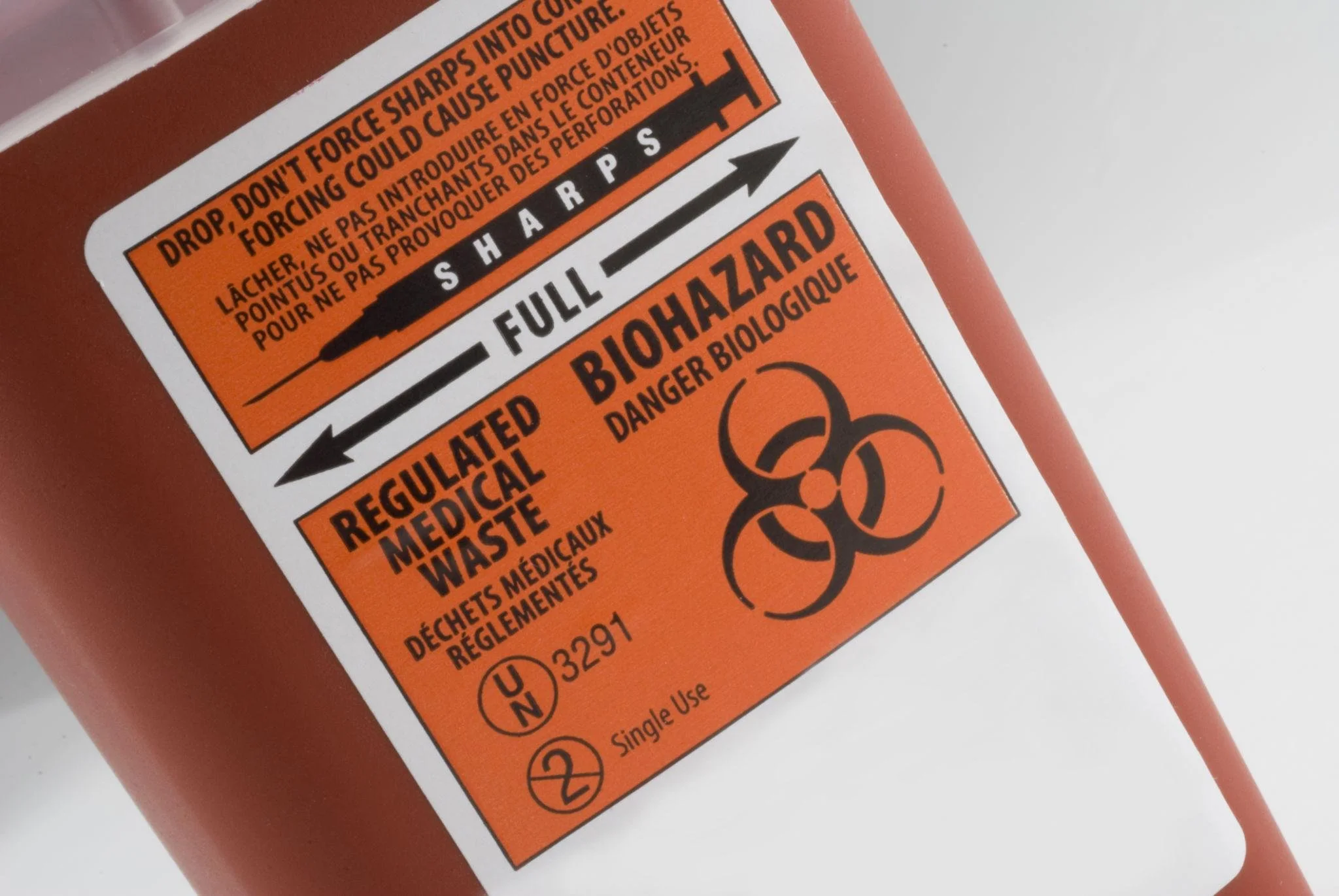 A special container for used needles and sharp medical tools.