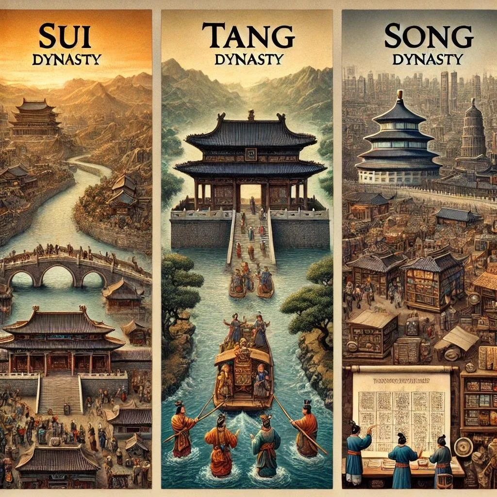 Emperor Yang Jian (Wendi) united China again — no more small kingdoms fighting each other! The most important event was the building of the Grand Canal. Imagine thousands of workers digging a long waterway to connect northern and southern China. This allowed food (like rice) to travel north and goods to move south. It helped the whole country survive and trade.Why is this important? Without the Grand Canal, the north would have struggled for food, and China might have split apart again.