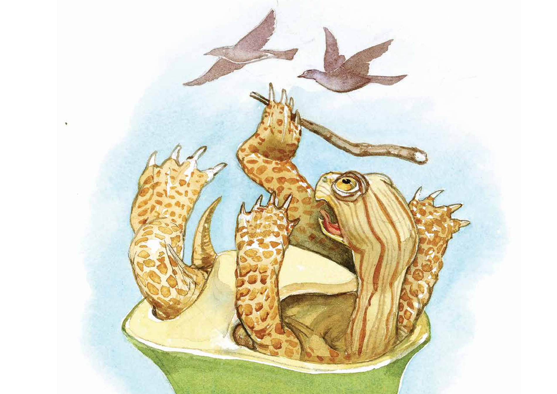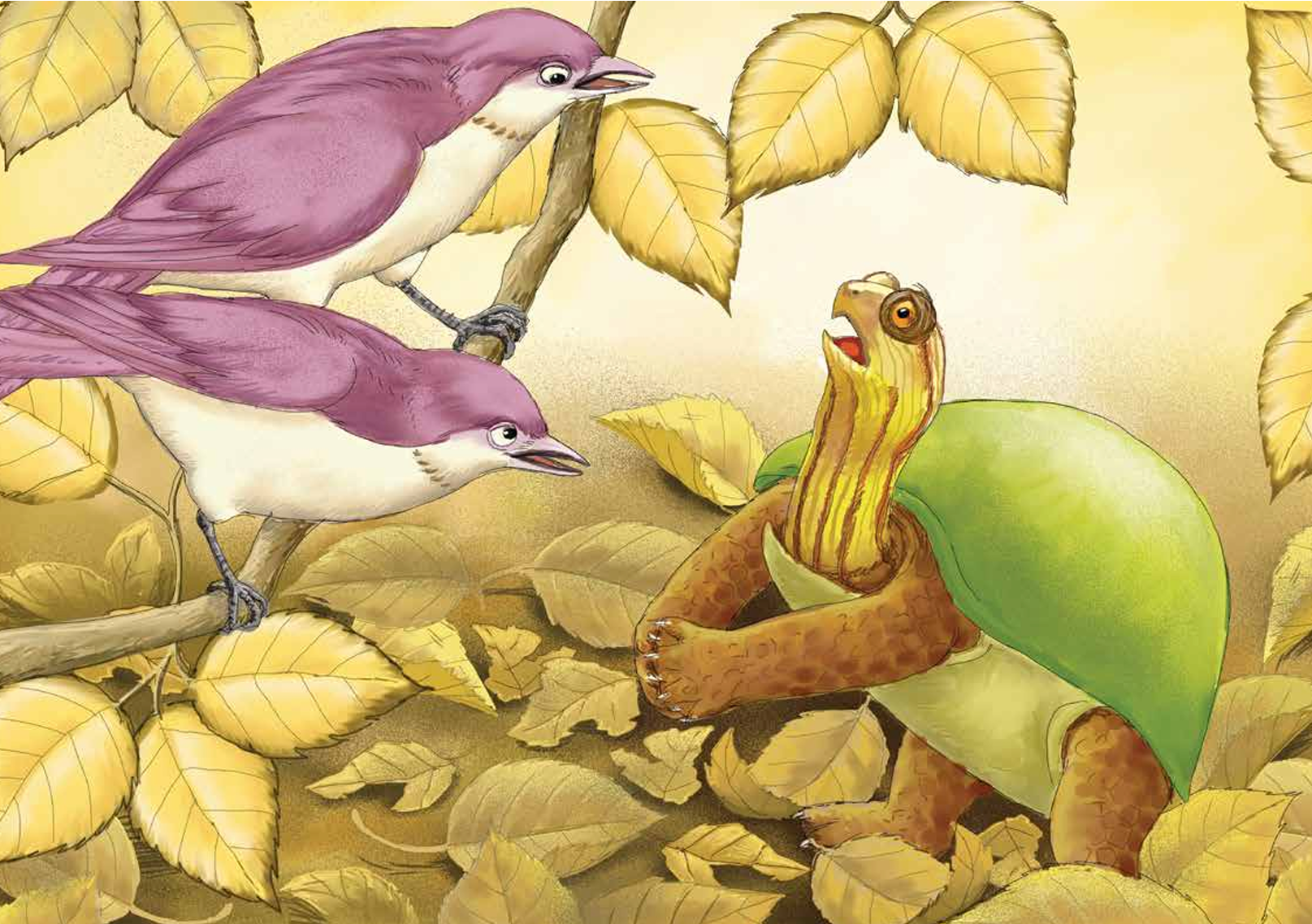 “Can I come with you?” asked Turtle. At first, the birds said, “No!” Turtle pleaded, “There must be some way I can go with you!” Finally, the birds agreed.