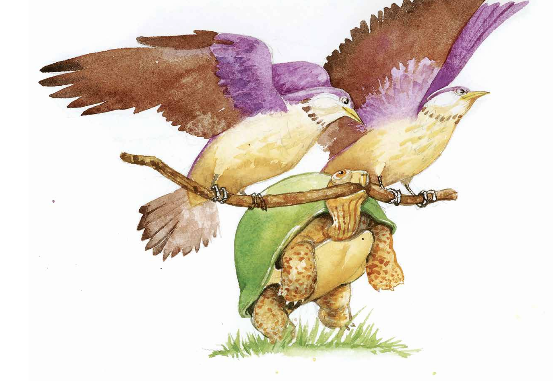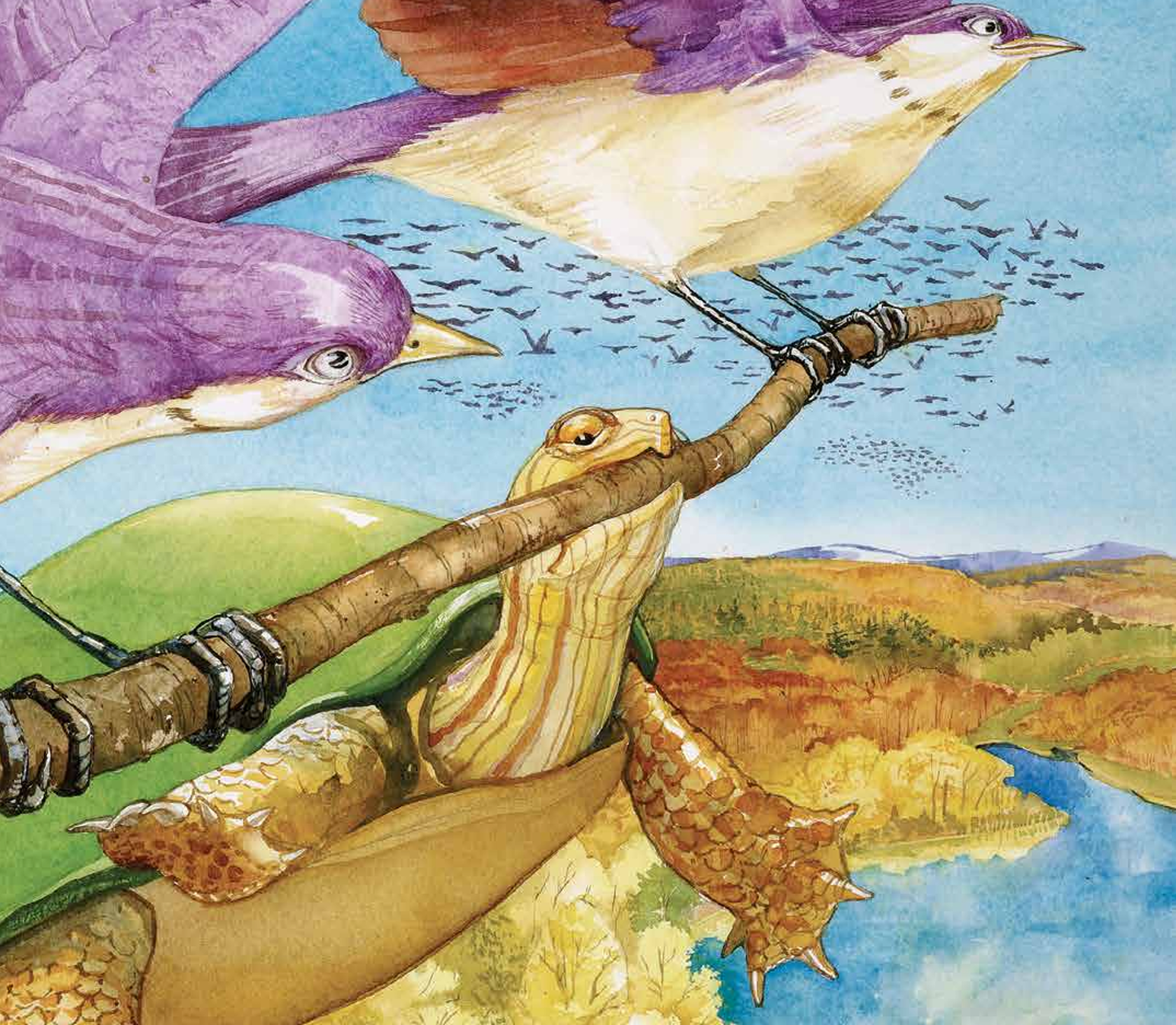 “Use your mouth to hold on tightly to this stick,” the birds explained. Turtle did just that.