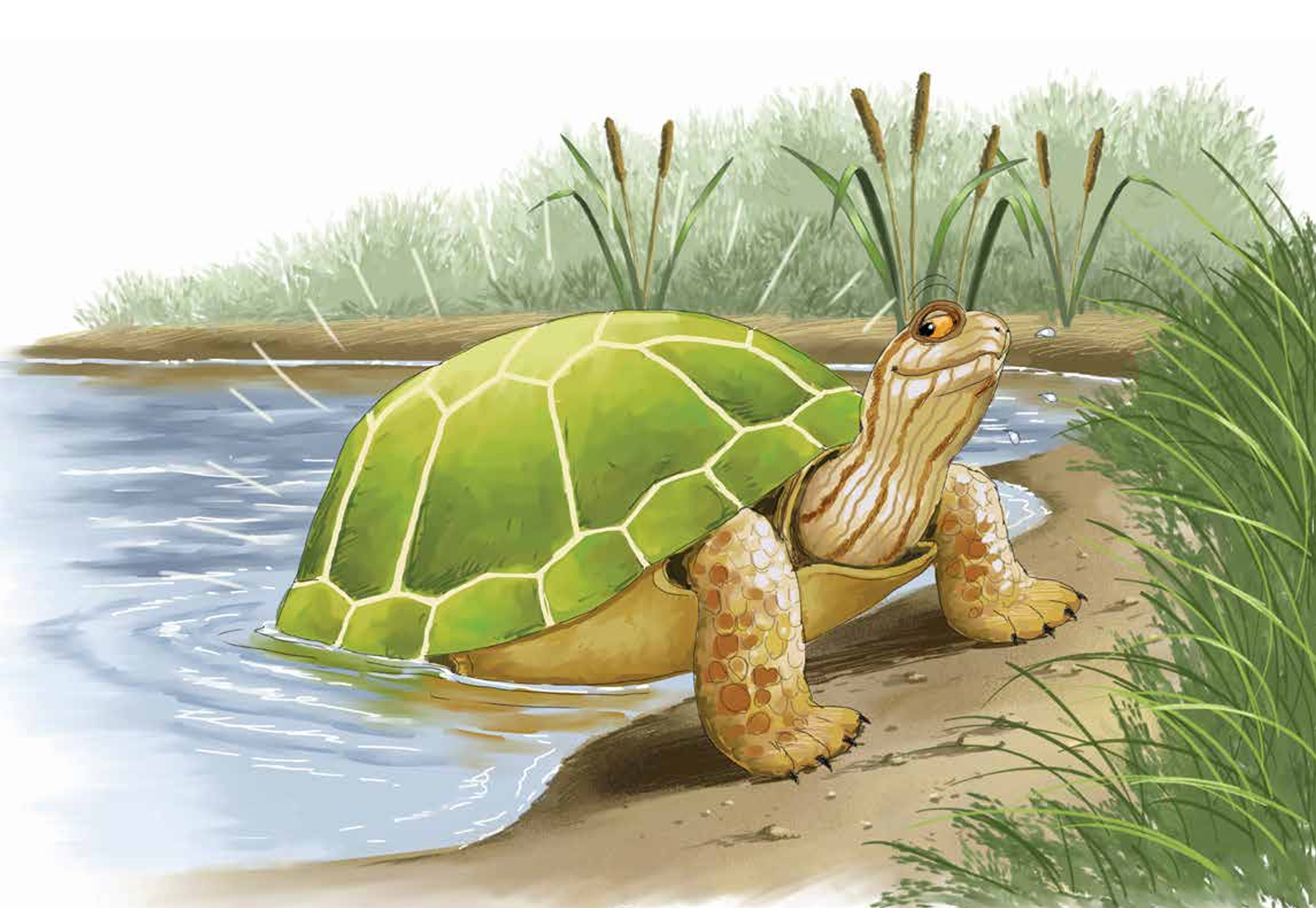 Turtle’s body ached. He ached so much he did not notice that his shell had cracked all over. He crawled into a pond and swam down to the bottom.