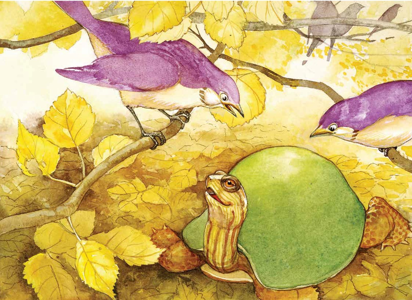 One autumn day, Turtle was talking with the birds. They said, “Winter is coming. Soon it’s going to be very cold here. We’re getting ready to fly south where it is warm.”