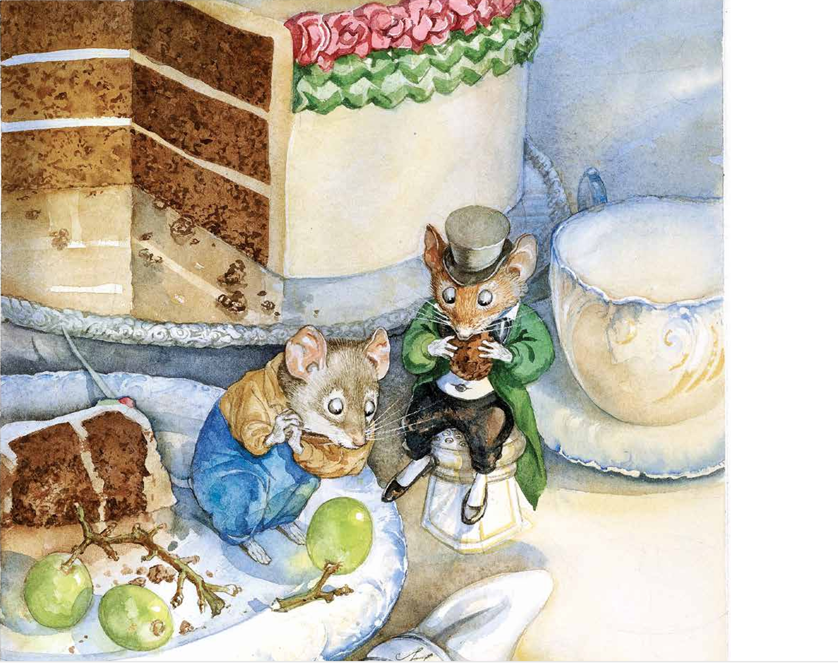 “A feast awaits us!” said the City Mouse proudly. The cousins secretly began to eat wonderful, delicious foods like ham and chocolate cake.