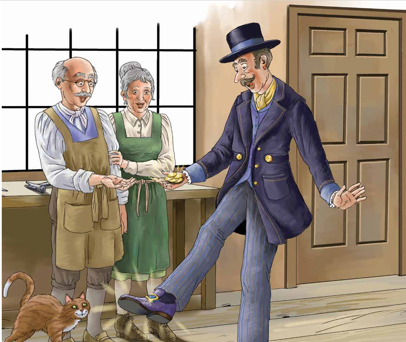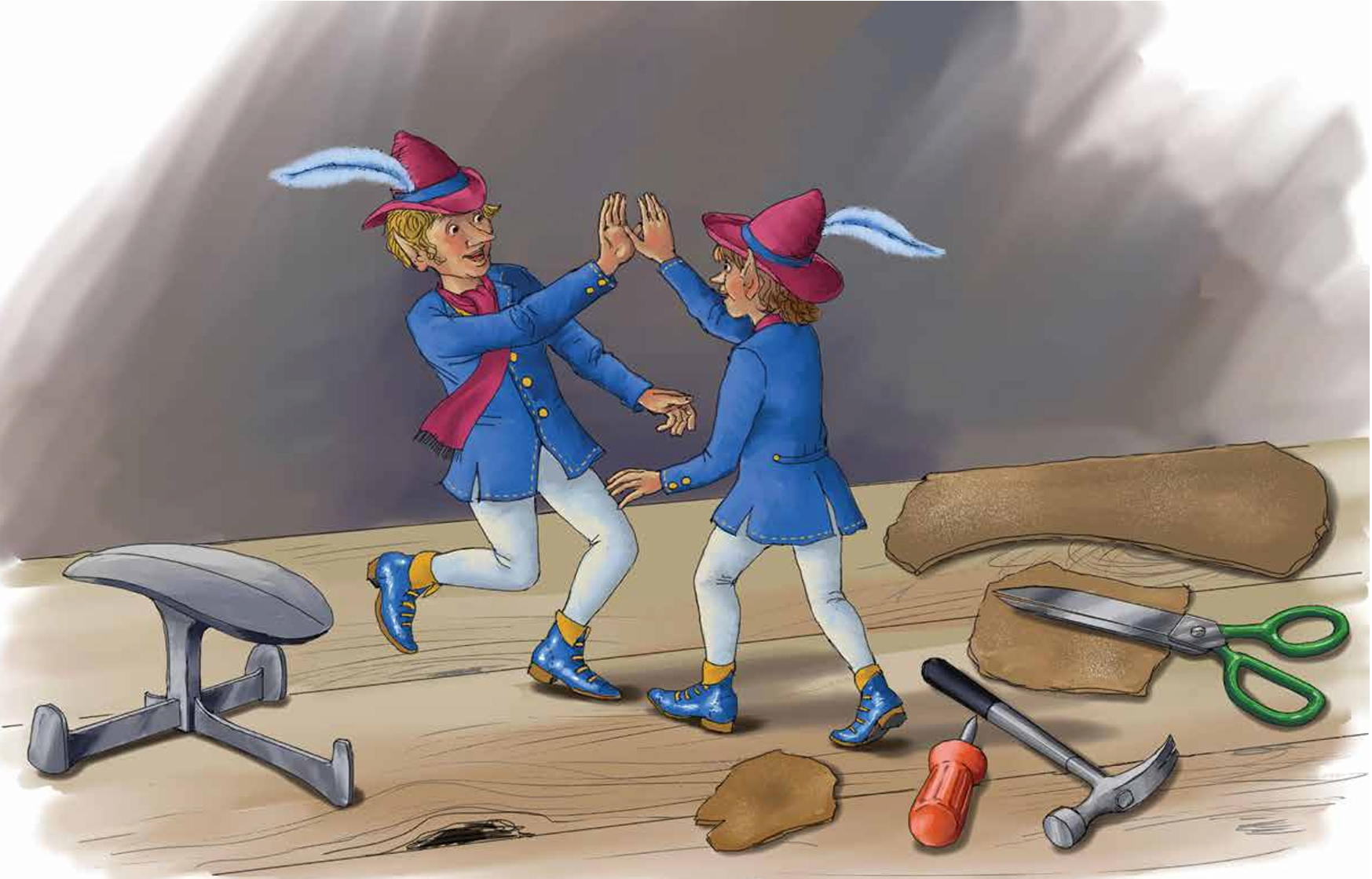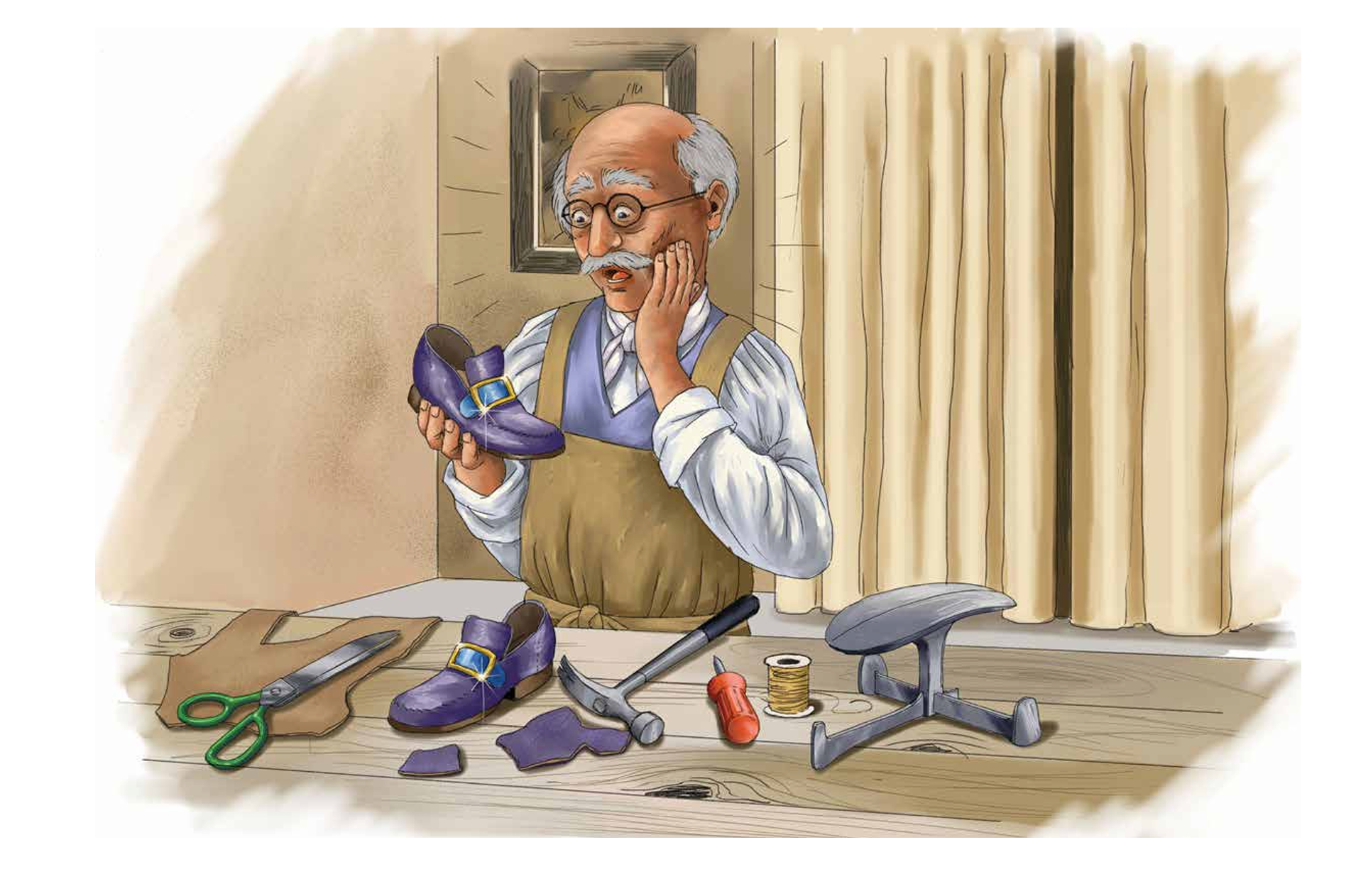 Once there was a poor shoemaker and his wife. “We only have enough leather left to make one pair of shoes,” said the worried shoemaker to his wife.
