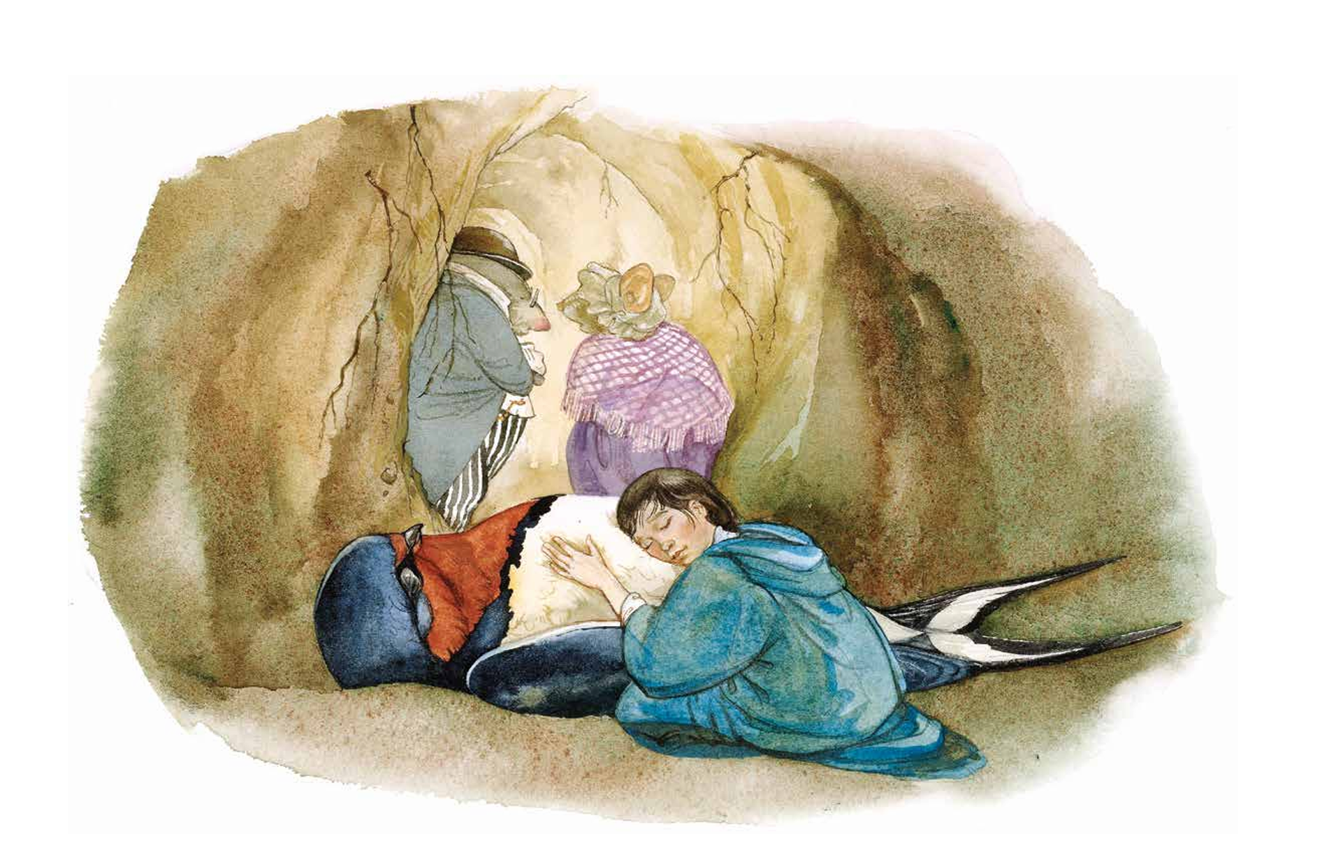 One evening, while visiting Mr. Mole, Thumbelina found a swallow. The bird was cold and hurt.
