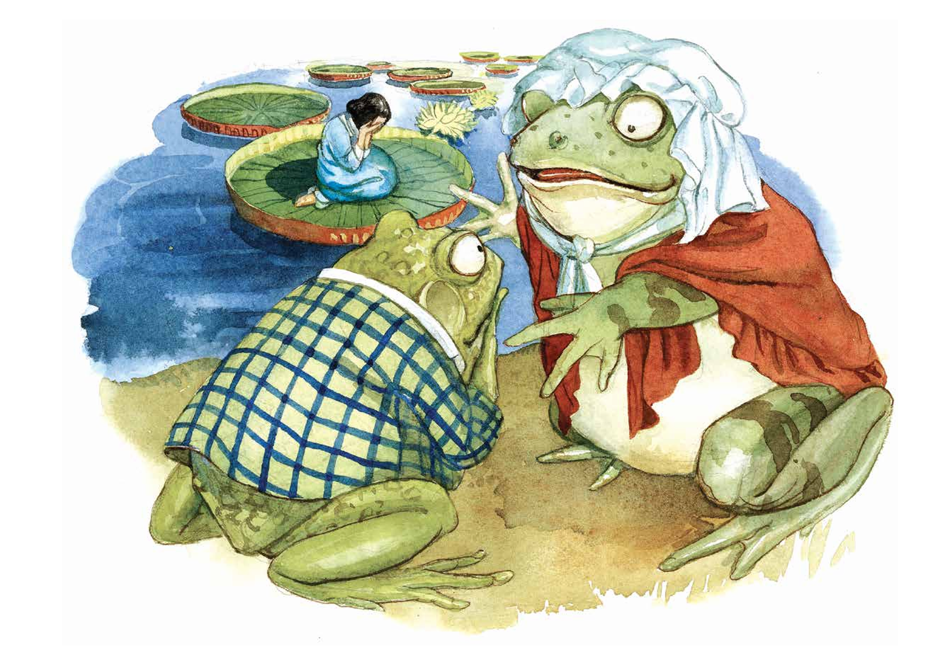 The mother toad and her son placed Thumbelina on a water lily leaf in the river. Then they set off to plan the wedding.