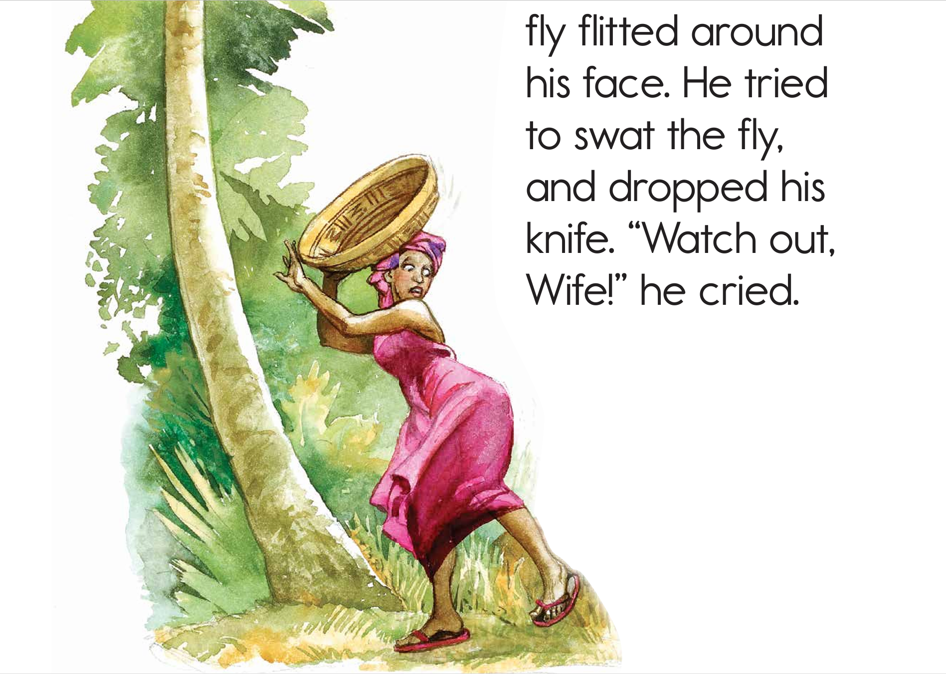 As the man reached for a coconut, a black fly flitted around his face. He tried to swat the fly and dropped his knife. “Watch out, Wife!” he cried.