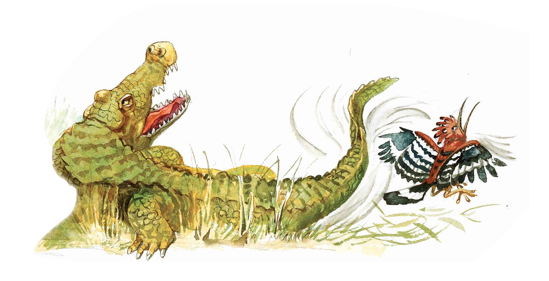 Nearby, a jungle bird was looking for bugs to eat. As the crocodile’s tail came down, the bird squawked— scree! scree! scree!